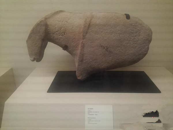 与这三尊雕像相伴的,是右手边的一组动物石雕像。虽然已成残件,仅有头颈部,但一件距今一万年的石马雕像却是本次文物展最有看点的展品之一,奥秘就在它颈部那道明显凸起的装饰上。翟胜利说,据研究,这个装饰有可能代表着早期的缰绳。
