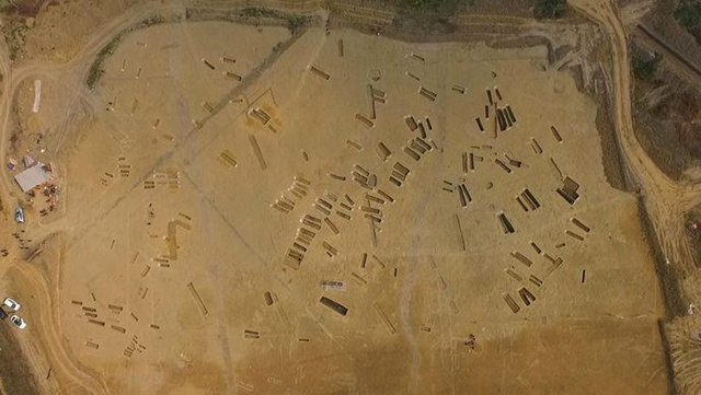 3日,记者走进发掘现场,看到足有两个足球场大的平地内,密集分布着大小不一的长方形竖穴土坑墓。墓坑大部分为南北向,少量为东西向,大部分墓葬葬具为船棺。多数墓葬成组分布,有的两座一组,有的三座一组,也有十多座一组。