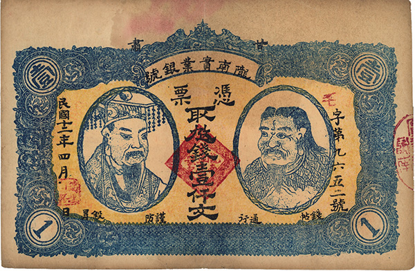 民国十二年(1923年)甘肃·陇南实业银号壹仟文,上印黄帝与神农氏双头像。
