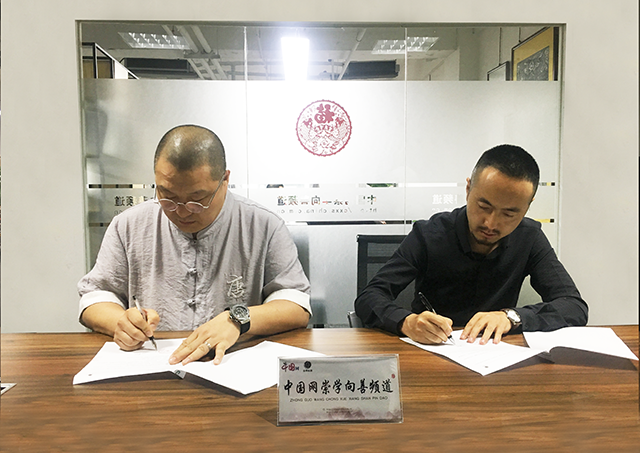 图:中国网崇学向善频道主编孔祥善(左)与传统唐卡绘制传承人桑杰本(右)签订协议