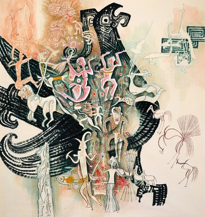 在民族文化宫的展厅里,张学智的印象岩画,有水墨的,有油画的,有黑白线描的,也有泼墨重彩的,有些是象形符号的复摹,有些是抽象变形和夸张写意。“远古的呼唤——张学智印象岩画‘一带一路’巡回展”展出了张学智80余件印象岩画作品,内容有反映太阳崇拜、祭天、狩猎、鏖战等远古人类生产生活的场景,还有基于岩画灵感而生发出的洪荒天地、野林古风、混沌初开等想象画面,呈现出一种神秘、诡谲、宏大、瑰丽、浪漫的艺术情境。
