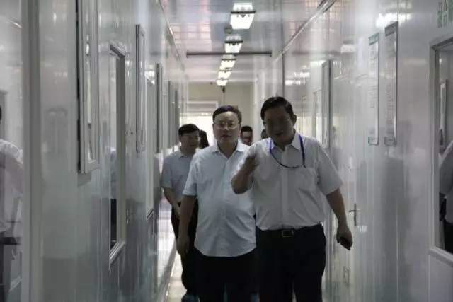 (图为参观考察公司无菌车间生产线,查看与湖南省食品药品监督管理局实时联网的整个车间监控)