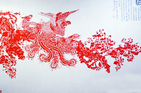 方军化的工作室位于肥西三河古镇中心的万年台下方,一进门,数十幅剪纸引入眼帘,梅开双寿、金玉满堂、十二生肖纳福等作品无不纤毫毕现,栩栩如生,最引人瞩目的是一幅凤凰傲翼图,两只火红的凤凰栖息在梅枝上,其中一只张开双翼,炫丽的尾羽,完美的体态,向人们展示着它的华贵气质。