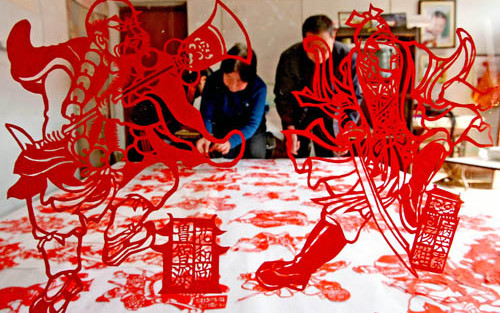 剪纸在中国农村是历史悠久、流传很广的一种民间艺术形式。剪纸,顾名思义就是用剪刀把纸剪成各种各样的图案,如窗花、门笺、墙花、顶棚花、灯花等。这种民俗艺术的产生和流传与中国农村的节日风俗有着密切关系,逢年过节抑或新婚喜庆,人们把美丽鲜艳的剪纸贴在雪白的窗纸或明亮的玻璃窗上、墙上、门上、灯笼上,节日的气氛便被渲染得非常浓郁喜庆。