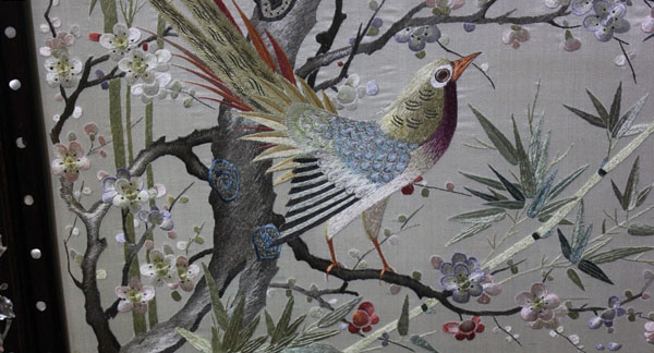 刺绣:刺绣是中国古老的手工装饰方法,指在加工好的织物上,按设计要求运针引线使绣迹形成图案的技艺。中国古代刺绣种类极其丰富,技法变化极多,除四大名绣外,按照地域可分为杭绣、鲁绣等地方绣种,彝族、傣族等少数民族绣种。刺绣技艺分为针法和绣法两个层次,针法是运针的基本方法,也是线条组织的形式。绣法是有选择地组合运用各种针法形成的刺绣方法,还包括选择相应的轮廓、丝理、配色以及线条的粗细、虚实等,这些因素的不同搭配和组合形成了不同的绣品。