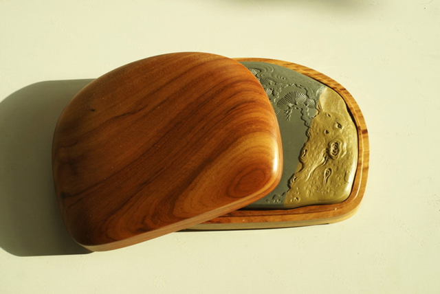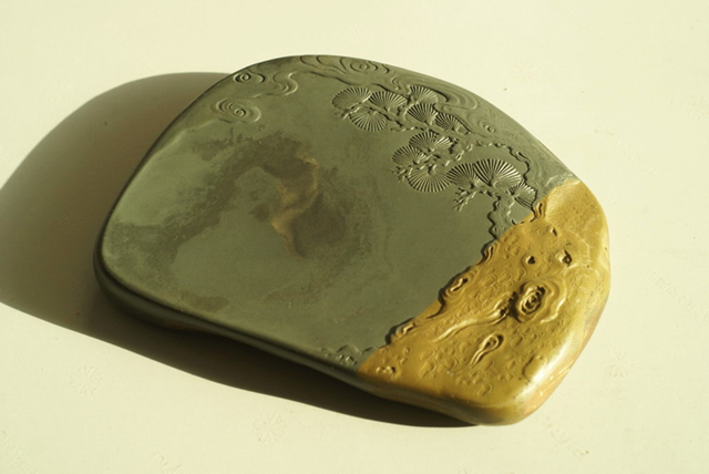 此砚始制于唐朝开元年间,砚以石为贵。南方端砚有眼,北方盘砚有线。由于盘石质地温润坚柔,纹理细腻缜密,坚而不脆,柔而不绵,铦而不刚,滑而不溜,晶莹似碧玉,璀燦如琥珀;加上精工雕刻,造型生动,古朴大方,发墨保湿,运笔流畅,素为书画家所珍爱。