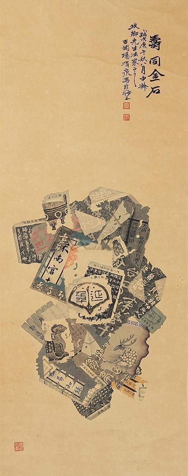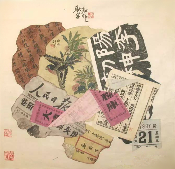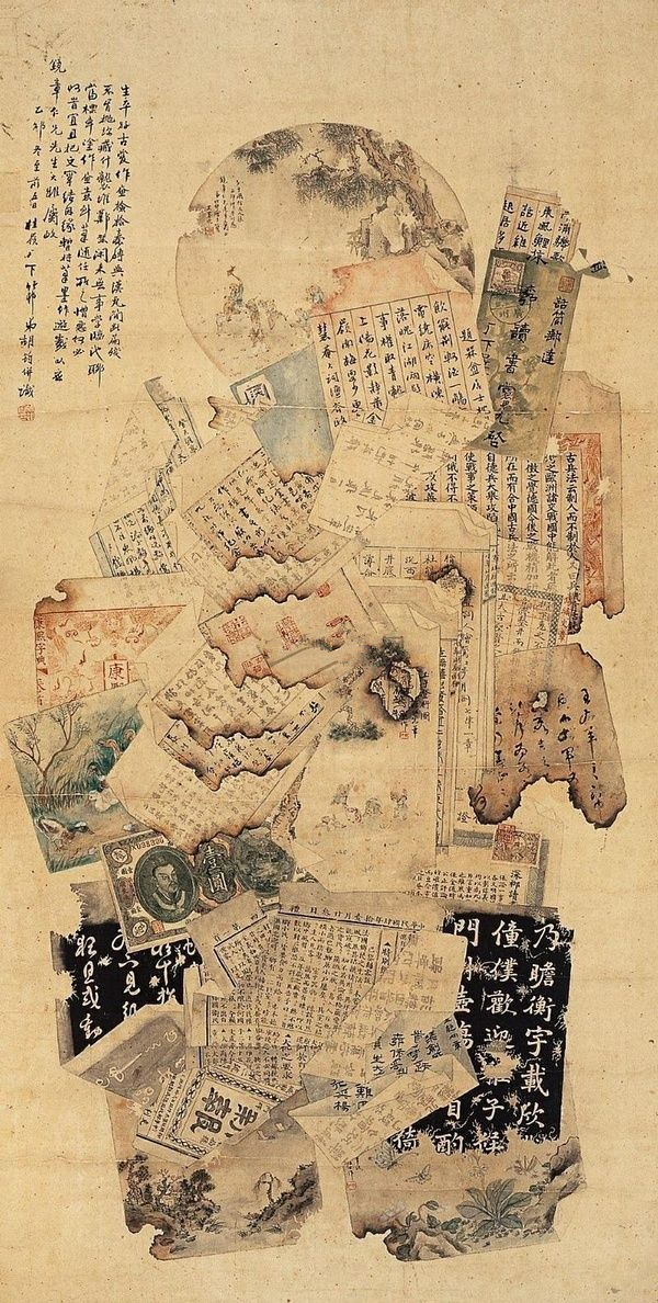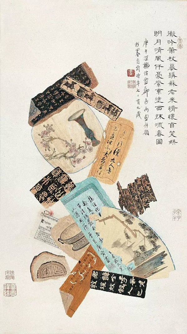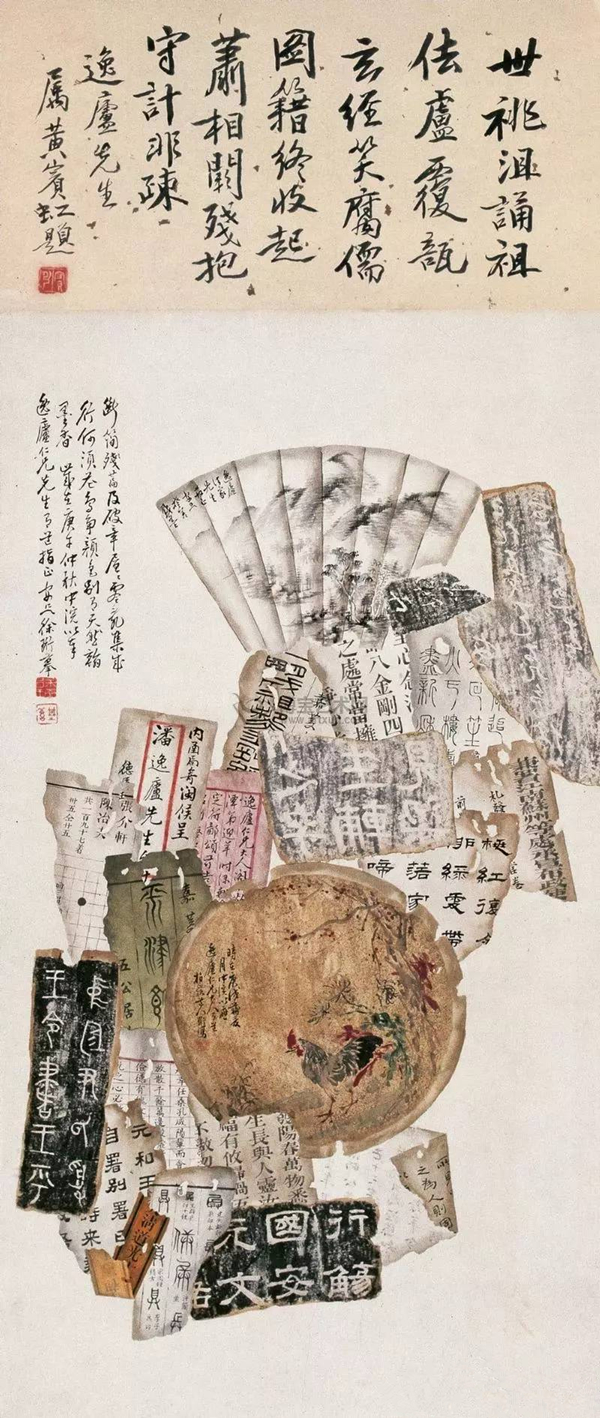 “锦灰堆”通常以熟宣入画,绘制物品需呈现出古旧面貌,或破损,或似火烧,或似虫蛀。其形式除挂轴外,也可绘在扇面上,或雕于器物之上。如各种残破扇面上的花鸟、山水、人物等,以及碑拓、青铜器拓片、书籍、信札,字体涵盖了草、隶、篆、楷等各种字体以及印刷体,还有各种落款、印章。或正面,或反面,或折角,在漫不经心中却能感受到精致的优雅,非常耐人寻味。
